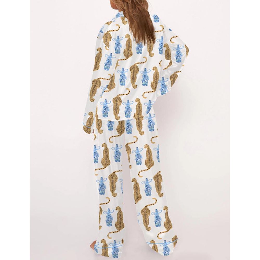 Cheetah Chinoiserie Champagne Bottle Satin Pajama Set For Women