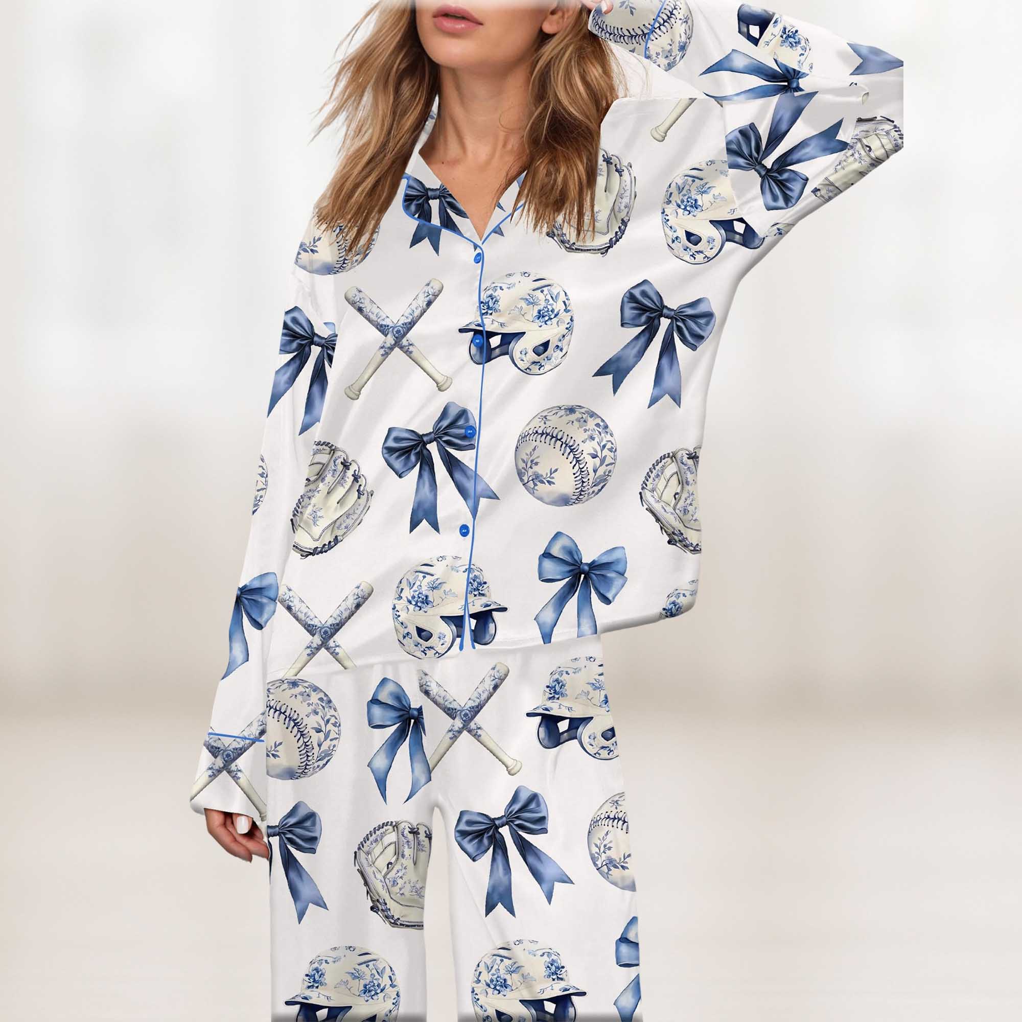 Chinoiserie Baseball Silky Satin Pajama Set For Women