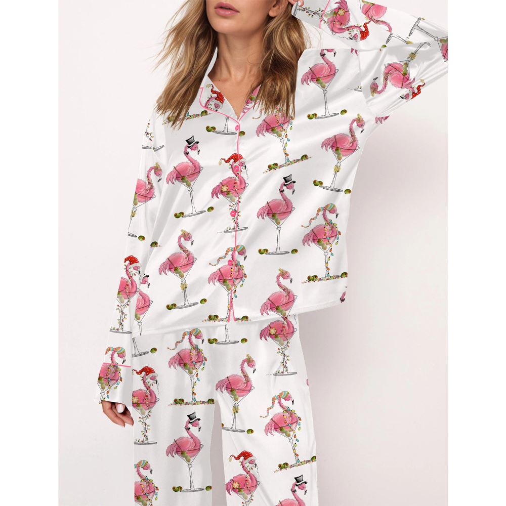 Christmas Flamingo Martini Satin Pajama Set For Women