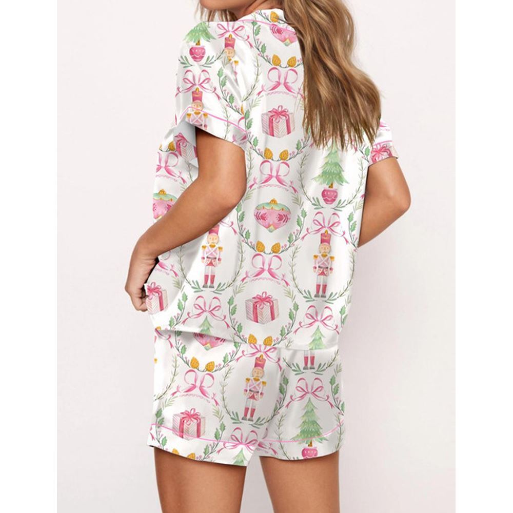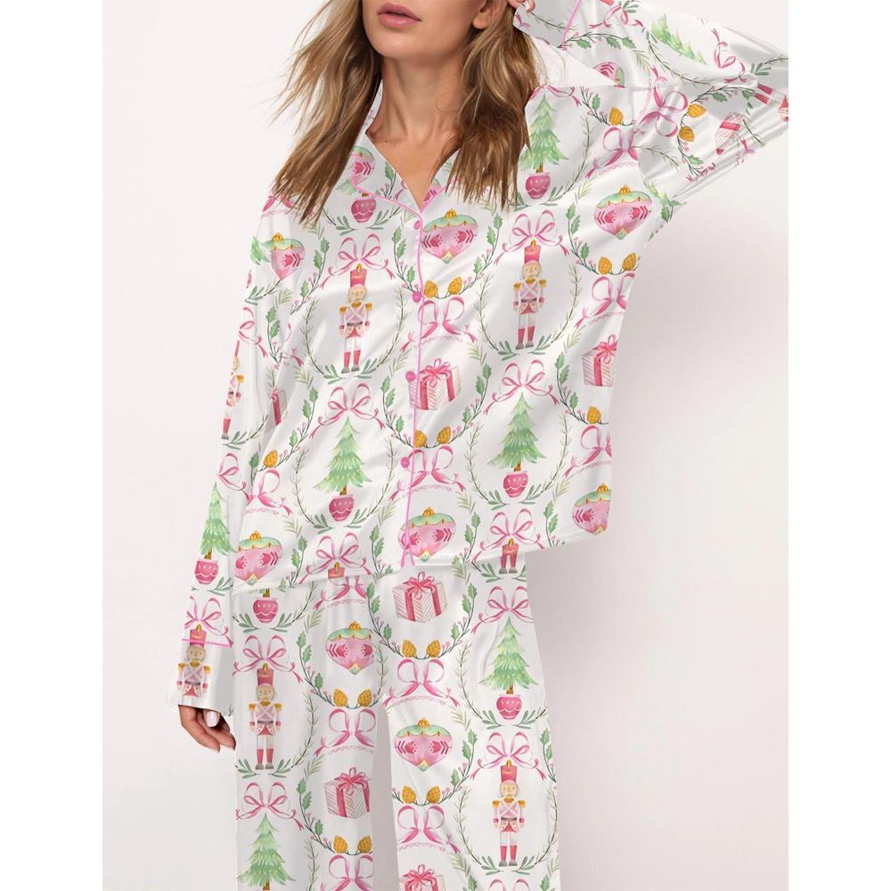 Christmas Wreath Nutcracker Satin Pajama Set For Women