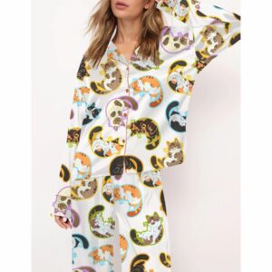 Cute Belly Cat Satin Pajama Set For Women