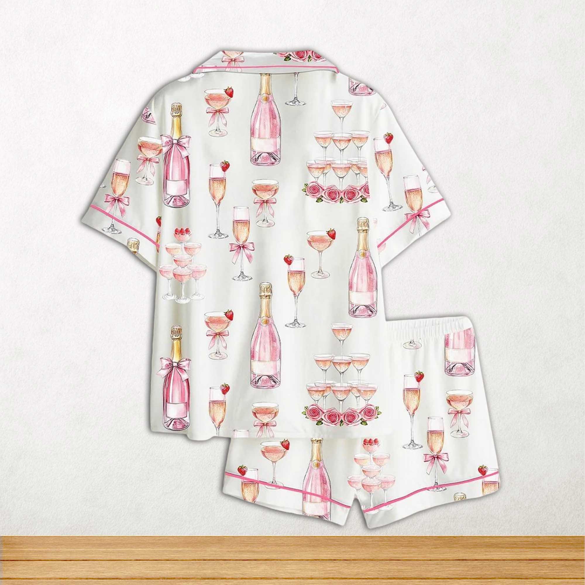 Pink Champagne Bridal Shower Champagne Tower Celebration Short Sleeve Satin Pajama Set For Women