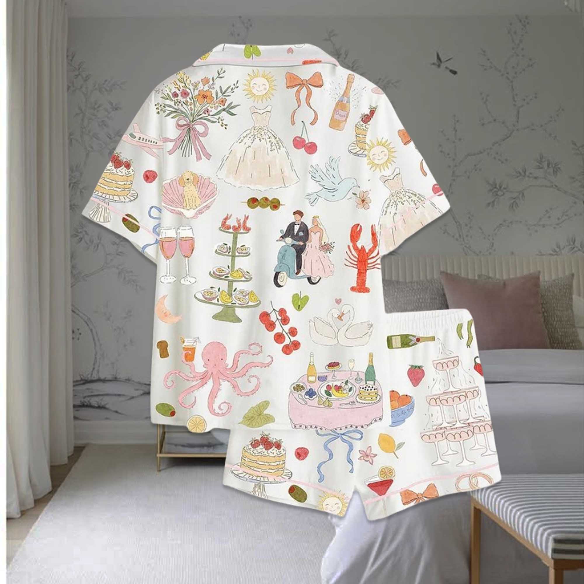 Whimsical Hand Drawn Watercolor Wedding Dolce Vita Summer Satin Pajama Set