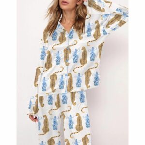 Cheetah Chinoiserie Champagne Bottle Satin Pajama Set For Women